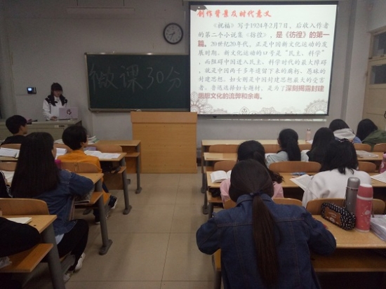 活动伊始,闫飞通过幻灯片的形式讲解鲁迅先生名作《祝福》,简单介绍了此篇文章的作者与写作背景。随后,闫飞别出心裁,以“祥林嫂的《刑侦报告》”的形式向学生展示了《祝福》这篇文章的大体脉络以及人物的不同特点,思路明确新颖,并从手法上深度剖析本文主要思想,指出祥林嫂的悲剧是封建礼教的压榨造成的,祥林嫂代表了封建时代受尽压迫的劳动妇女形象。最后,班长就此次课堂活动做出总结,指正了讲课速度的控制问题,肯定了课件的新颖性。此次活动圆满结束。