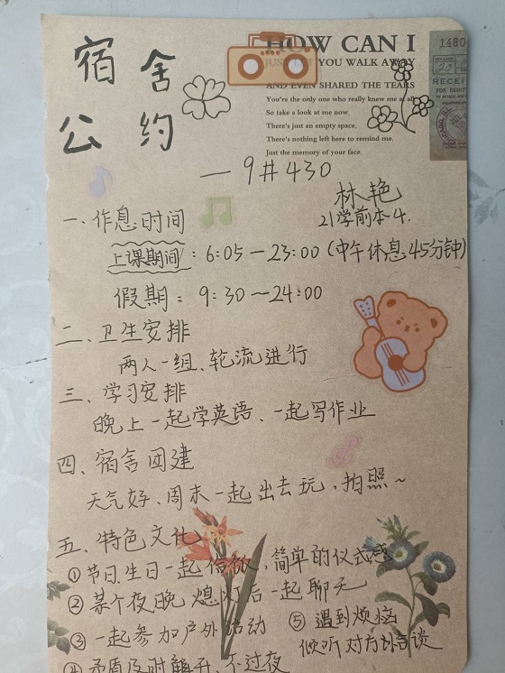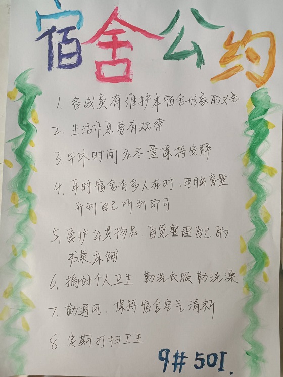 本次评比活动采用线上组成的评委组和线上微信投票的方式,从设计主题是否突出、设计创意是否新颖、设计内容是否美观等角度,最终评选出10份特色宿舍文明公约。活动过程中,各参赛寝室成员充分发挥自身专业特长,运用鲜艳的色彩、卡通人物和各具特色的艺术字进行寝室公约创作。此次参赛作品类型多样、画作精致可爱、形式新颖有趣,参赛学生自主创新寝室公约,不仅内容贴合主题,而且排版富有创意,寝室成员围绕作息时间、寝室卫生、行为规范等方面进行设计,全方位向广大师生展现自己宿舍的独特风采。至此,本次活动圆满结束。
