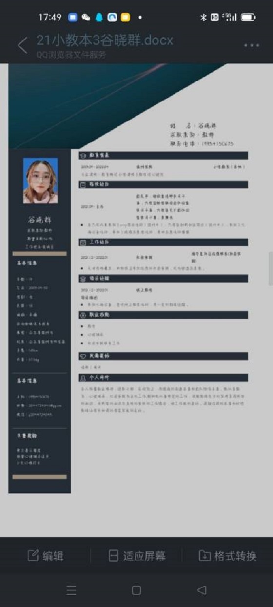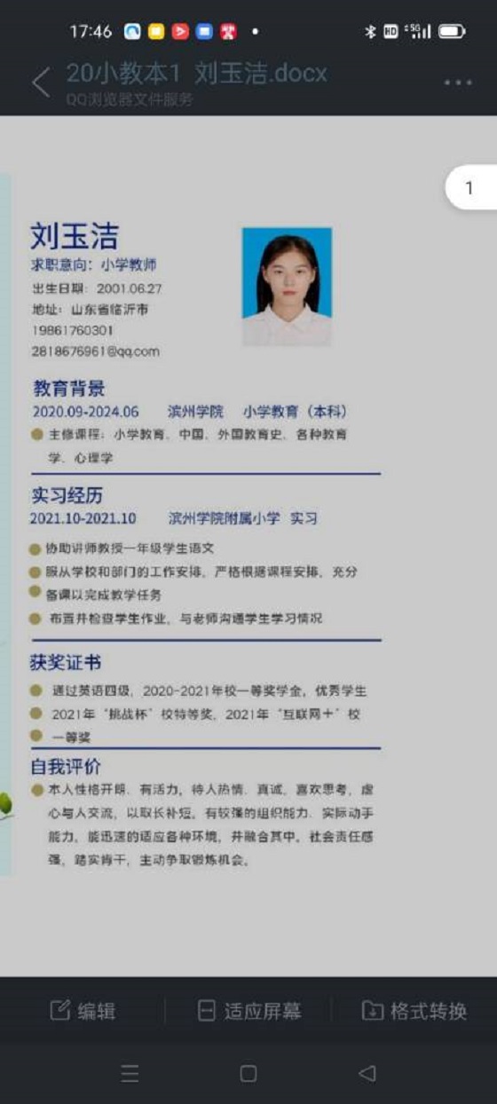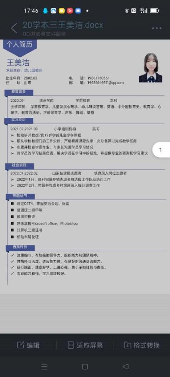 此次活动以线上的方式进行,学生踊跃报名,积极参与。活动伊始,学生立足实际,根据自身的优缺点,结合时代背景与社会需求,做出简历的大致框架。紧接着,学生积极上网搜集资料,了解面向单位的方方面面,结合自身需求,有针对性的对简历展开设计、填写。在对简历深度设计后,学生对简历进行筛减、美化,简历内容凝练语句、重点突出,简历设计新颖别致、大方明了,可见参赛学生的良苦用心。最后,根据所呈现作品的主题、内容、形式方面,由学生代表评选出优秀作品并施以嘉奖。至此,此次活动圆满落下帷幕。