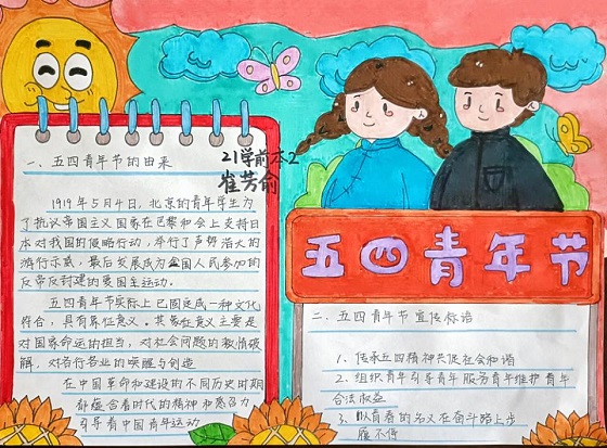 此次活动采取线上作品征集的形式开展,通过手抄报和电子海报两种形式进行,学生可从中任选一项进行创作。学生积极参与,踊跃报名,用画笔绘出青年心中的五四精神,表达对五四精神内涵、时代主题深刻理解,彰显出当代青年的力量。此次活动参赛作品种类丰富,各具特色,主题鲜明,视觉冲击力强,学生发散性的思维和奇思妙想使作品饱含着丰富的内涵,体现出参赛学生高超的创作功底。最后,志愿服务部干事根据参赛学生作品主题、内容等多方面评选出优秀作品。至此,活动圆满结束。