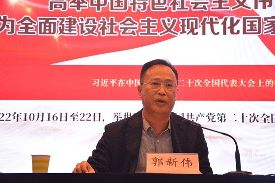 郭新伟重点围绕党的二十大主题和主要成果、过去5年的工作和新时代10年的伟大变革、马克思主义中国化时代化、中国式现代化、全面建设社会主义现代化国家的目标任务、坚持党的全面领导和全面从严治党、应对风险挑战牢记五条必由之路等方面对党的二十大精神进行了深刻阐述和详细解读。郭新伟指出学习宣传贯彻党的二十大精神,是学校当前和今后一段时期的首要政治任务,要提高政治站位,加强组织领导,在全面学习、全面把握、全面落实上下功夫。一要聚焦学习,学深悟透;二要聚焦宣传,入脑入心;三要聚焦落实,见行见效。郭新伟强调要真正把党的二十大精神贯彻落实到学校事业改革发展各方面、全过程,聚焦学校“十四五”事业发展规划确定的“一二三十七”目标任务,结合学校年度工作要点,找准结合点和着力点,明确任务、科学谋划、精心准备,唯旗是夺,勇争第一。郭新伟还勉励广大青年学子,要以理想者、担当者、吃苦者、奋斗者的姿态,践行“请党放心、强国有我”的青春誓言,奋进新征程,诠释新青春,创造新业绩!