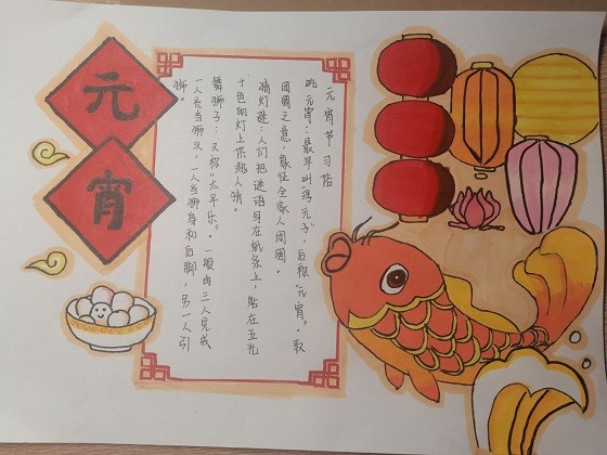 此次活动采用线上方式进行,活动伊始,学生积极报名,踊跃参与。该活动以传统节日元宵节为背景,在活动过程中,学生巧妙创作,变废为宝,将酒盒子、橘子皮等废旧物品,制作成元宵花灯、团扇、纸扇等传统艺术作品,将绿色节约的理念贯彻到日常生活中。其中部分同学采用绘制元宵节手抄报和设计元宵节卡通人物的形式,来表达自己的独特想法,展现中华传统文化的魅力。精致巧妙的艺术作品充分表现出学生对传统文化的热爱。活动最后,学生纷纷表示元宵节作为中国的传统节日,蕴含着深厚的文化底蕴,自己将会更加努力了解并发扬其背后的文化内涵。此次参赛作品各具特色,主题鲜明,体现出参赛学生优秀的创新精神,动手能力和创作水平。至此,活动圆满结束。