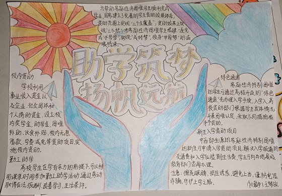 活动伊始,学生踊跃报名,通过多种途径搜集素材,认真思考作品的形式与内容,并准备创作工具。活动过程中,学生基于自身对资助政策的了解,充分发挥创造力与想象力,结合生活实际,深刻体会资助政策中所蕴含的价值取向,明确创作中心思想,认真构思作品结构,合理安排作品内容。学生作品通过剪纸、手抄报、短视频等多种形式呈现,各具特色,主题鲜明,充分体现参赛学生的创新精神、动手能力和创作水平。活动最后,评选人秉持“公平、公正、公开”原则,评选出优秀作品。至此,本次活动圆满结束。