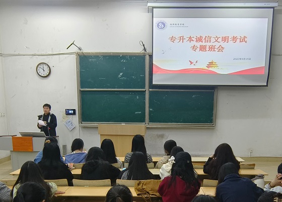 为进一步端正考风、严肃考纪,加强对专升本考生的诚信考试教育,4月16日,QY球友会体育于1号教学楼106室开展专升本诚信考试教育主题班会。本次班会由学生科副科长刘俊杰主讲,QY球友会体育2023届全体专升本学生参加。
