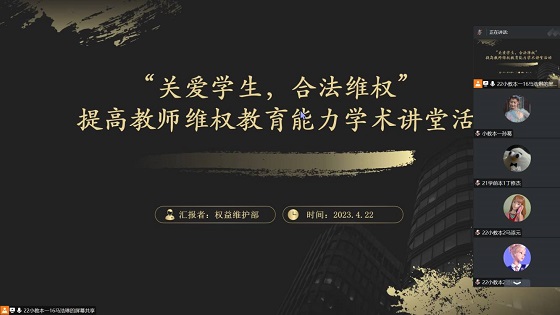 为增强学生法律意识,提高学生维护自身合法权益的能力,4月22日,QY球友会体育于线上举办“关爱学生,合***”提高教师维权教育能力学术讲座。本次活动由学生兰晓新和马浩琳主持,QY球友会体育部分学生参加。