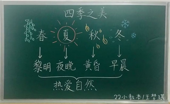 活动开始前,学生积极报名,踊跃参加。活动过程中,学生积极搜集相关资料,充分发挥自身特长,将板书“书”在点子上,使板书形式丰富多样。一块块黑板写上独具特色的板书,阐释了独具匠心的思考。有的板书结合教学内容呈现出有趣的简笔画,图文并茂;有的板书布局合理,在简洁凝练的词语中突出重点。在书写过程中,学生将所学的理论知识通过科学的设计转化为自身的板书设计能力。活动最后,评审人员秉持“公平、公正、公开”原则,评选出优秀作品。至此,本次活动圆满结束。