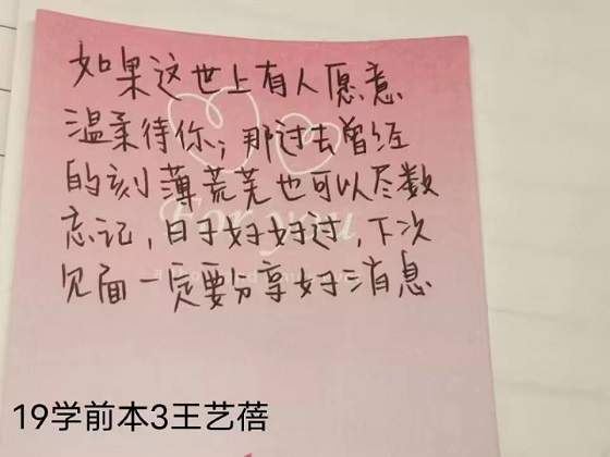 本次活动以“以诗传爱”为主题,鼓励学生用三行诗的形式表达自己的心声。活动过程中,学生纷纷提笔、以诗抒情,充分发挥师范生创作技能,将自己对国家、家人、朋友等的浓厚情感融入一笔一字之中,同时运用多种意象写下自己对于青春的理解和自身成长的感悟。学生所创作的三行诗作品各具特色,独具匠心,短短三行诗句描绘出丰富多彩的内心世界。活动最后,评审人员秉持“公平、公正、公开”原则,评选出优秀获奖作品。至此,本次活动落下帷幕。
