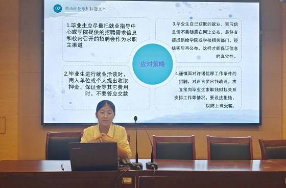 本次活动旨在教育学生知法、懂法、用法,引导学会利用法律武器武装自己,保护自己,帮助学生健康成长,走好人生的每一步。会上,李素娟详细向学生阐述学习安全法制知识的重要性,她强调安全是一切活动的基础,是不可超越的先决条件。随后,李素娟分别从校园安全、防火安全、防溺水安全、交通安全、不良行为预防等方面入手,详细讲解如何预防和脱离危险,为学生送上一份“安全攻略”,引导学生积极运用所学安全法制知识,保障自身合法权益不受侵害。紧接着,李素娟结合最近频繁发生的网络诈骗事件等相关实例和有关法律,提醒学生警惕各种求职骗局以及网络招聘骗局,帮助学生提高对非法传销、非法中介的辨别能力,防止学生上当受骗,将安全意识深入每位学生心中。活动最后,学生纷纷表示会在以后的学习和工作中遵守法律法规,时刻敲醒安全的警钟,并力所能及地参加安全法制知识宣传方面的实践活动。至此,本次活动圆满结束。