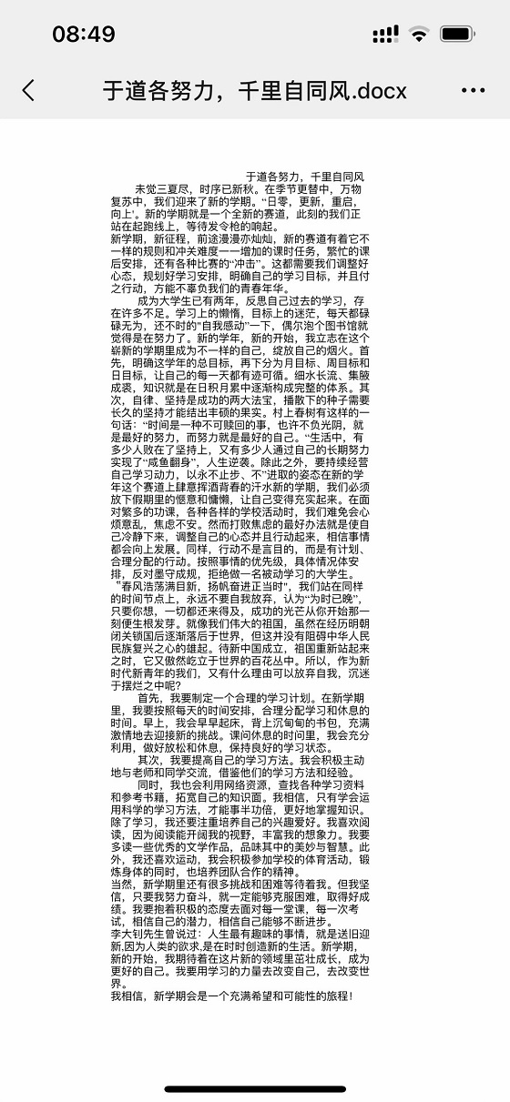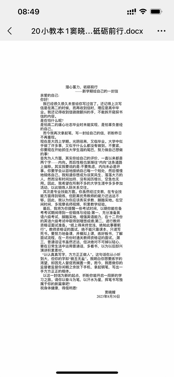 活动一经发布,学生踊跃报名,积极参与。活动过程中,学生结合切身感受以细腻的笔触写下对未来的规划与期望,反复修改力求做到精益求精,构思巧妙的文章彰显出学生优秀的撰写能力与新学期积极向上的精神面貌。活动最后,学生纷纷表示通过本次活动浮躁的心态得以平复,增强了积极进取之心,未来将以更加积极的精神面貌和饱满的学习热情投入到学习生活中。活动结束后,评选人员秉着公平、公正、公开原则评选出优胜作品。至此,本次活动圆满完成。