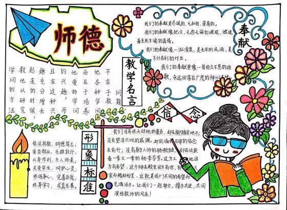 活动伊始,学生通过查询网络、纸质书等途径了解教师必备素养,丰富知识储备,以提高手抄报的信息量和可读性。活动过程中,学生热情高涨,充分发挥自己的创新能力,积极参与投稿,用色彩描绘对教师职业的热爱,用文字表达对教育的理解。一幅幅色彩绚丽、构思精巧的绘画作品,文字书写规范美观,与图画相得益彰,充分展现了学生对教师行业的深切热爱和美好愿景。活动最后,学生对作品进行交流与展示,纷纷表示自己对教师这一行业有了更深刻的理解,并立志要做一名优秀的人民教师。至此,本次活动圆满落下帷幕。