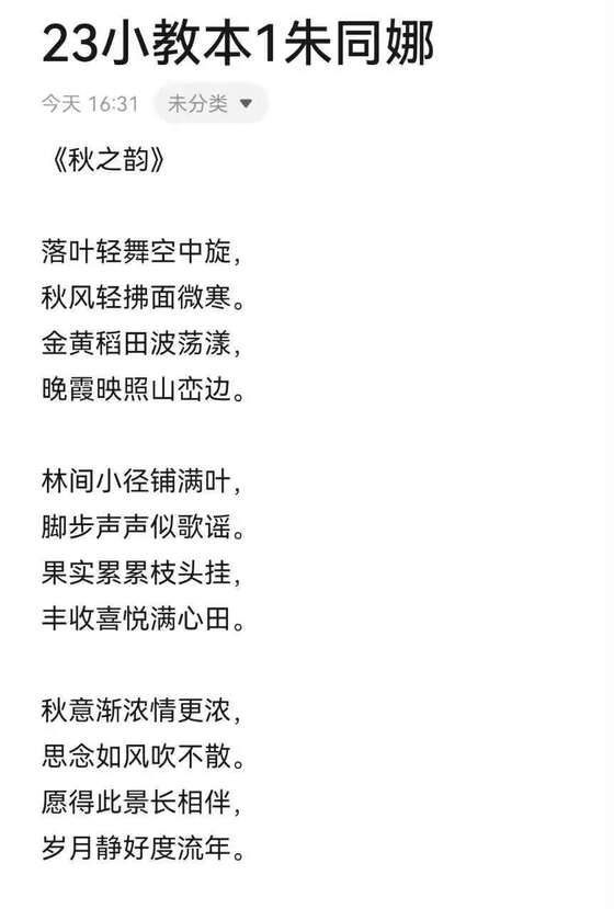 本次诗歌大赛旨在引导学生以细腻笔触描绘秋日景色,尽情抒发内心深处的真挚情感,从而有效提升自身文学素养。活动伊始,学生热情高涨,积极参与。活动过程中,学生深入校园每一个角落,仔细观察,用心体悟,自然之景触动心弦,灵感乍现如夜空中的流星划过,点燃创作的激情,随后,学生围绕灵感确定主题,精心构思立意,遣词造句,同时高度注重韵律和节奏的完美把握,最后,反复修改如工匠对艺术品的雕琢,精益求精,创作出独具匠心的作品。活动结束后,评选人员以专业的眼光和严谨的态度对每一篇作品进行认真评审,整理获奖名单。至此,本次活动圆满结束。