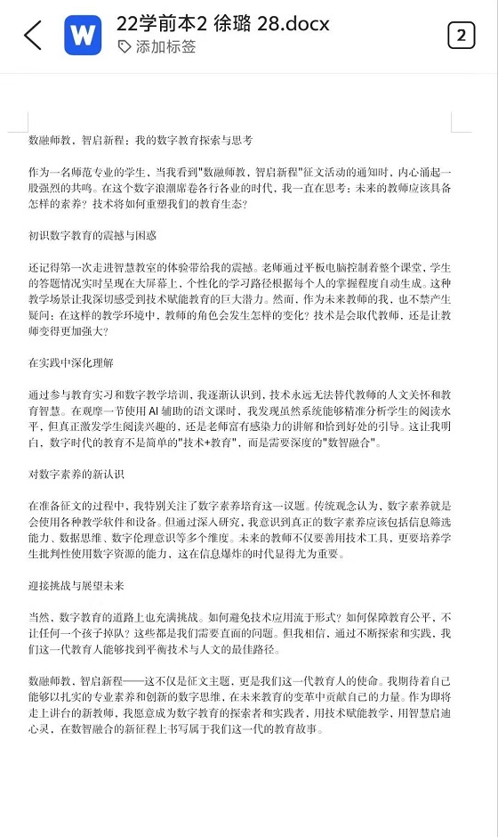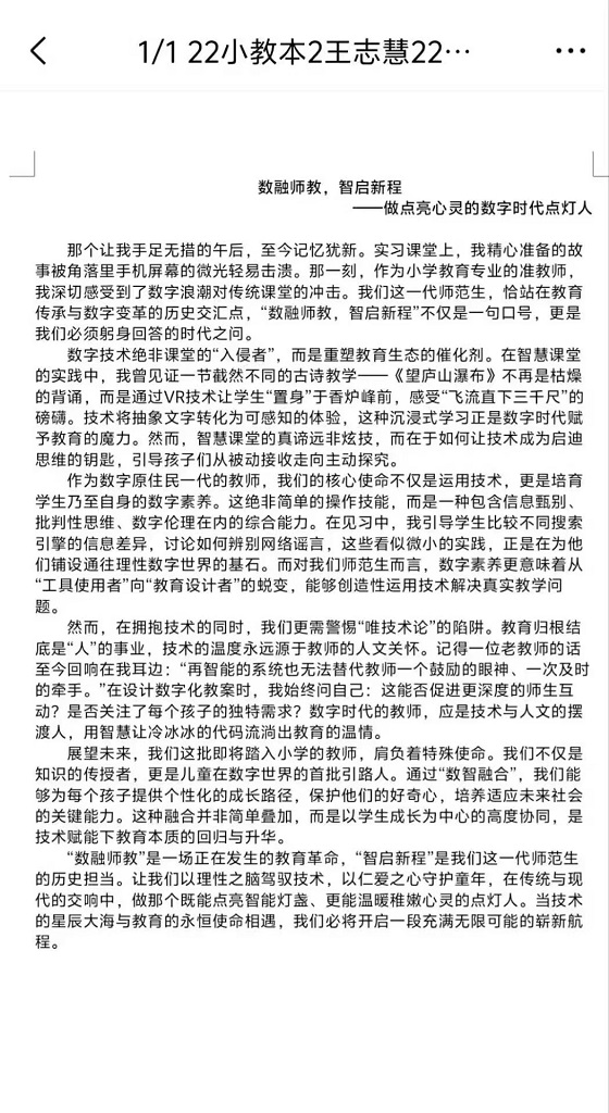 本次活动旨在引导学生厘清数字技术与教师教育的融合逻辑,培育其应对教育数字化转型的核心素养。活动伊始,学生热情高涨,提前查阅数字教育相关文献,积极为征文创作做准备。活动过程中,学生紧扣“数字素养”“智能教学”核心方向,结合课程学习与见习经历撰写征文,内容兼具理论思考与实践案例,充分展现对教育数字化变革的密切关注。活动最后,学生纷纷表示,此次征文活动不仅锻炼自身逻辑思辨能力,更增强运用数字技术推动教育创新的信心与担当。至此,本次活动圆满结束。