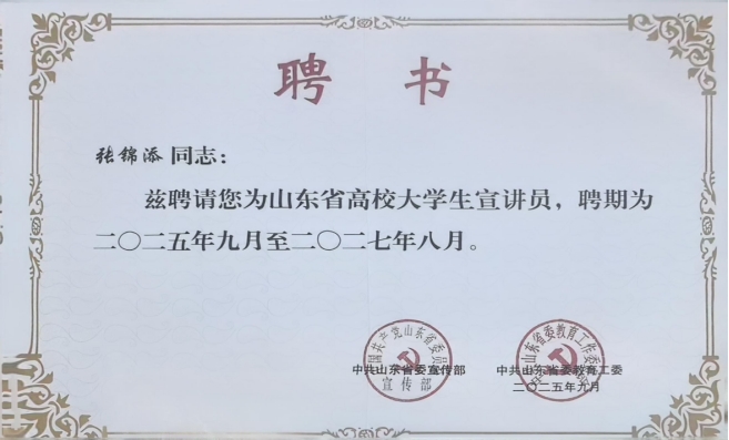 近日,QY球友会体育2023级小学教育1班学生张锦添被山东省委宣传部、省教育厅(省委教育工委)正式聘任为“山东省高校大学生宣讲员”(2025-2027年)。