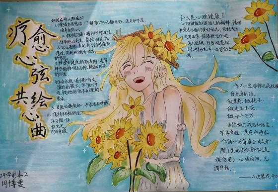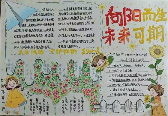 本次活动旨在宣传心理健康知识,增强学生心理保健意识。活动伊始,学生积极了解竞赛信息,踊跃报名,自主查阅心理健康资料,了解和学习心理知识。活动过程中,学生各显神通,运用对称式、环绕式等多种构图方式设计手抄报。随后,采用图画与文字相结合的方式,将心理知识展现在手抄报上,使手抄报元素丰富多彩,色彩鲜亮,充分展现对制作心理手抄报的浓厚兴趣。活动最后,学生纷纷表示,通过活动深入了解到心理健康知识,明白心理知识的重要性,增强了自我心理调节能力,也使自身审美能力和绘画技能得到提升。至此,本次活动圆满结束。